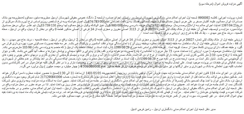 شماره پرونده اجرایی: کلاسه 9900092 شعبه اول اجرای احکام مدنی دادگستری شهرستان اردبیل در راستای اجرای صادره ازشعبه 2 دادگاه عمومی حقوقی شهرستان اردبیل مطروحه مابین، محکوم له:مطروحه بین بانک صادرات ایران محکوم علیه: آقایان صفر و علی هردو شهباز مغانلومحکوم علیهما محکوم هستند به پرداخت تضامنی مبلغ674/783/000ریال اصل خواسته وبه نرخ شاخص روزبراساس نرخ تورم بانک مرکزی از تاریخ1397/04/25 لغایت اجرای حکم به ازاء23درصددرسال ،ومبلغ23/325/405ریال هزینه دادرسی ومبلغ6/960/000ریال حق الوکاله وکیل درحق محکوم لها ومبلغ 33/739/150ریال نیم عشر دولتی درحق صندوق دولت،مورد مزایده و توصیف اجمالی آن: طبقه اول از ملک پلاک ثبتی شماره 20027 فرعی از 3113 اصلی مفروز و مجزی شده از 14 فرعی از اصلی مذکور قطعه 0 واقع در بخش 2 اردبیل، واقع در اردبیل ، محله قاسمیه ، دربند حاج میر مهدی ، ، پلا ک 44 به شرح زیر ارزیابی و برآورد قیمت شده است؛
