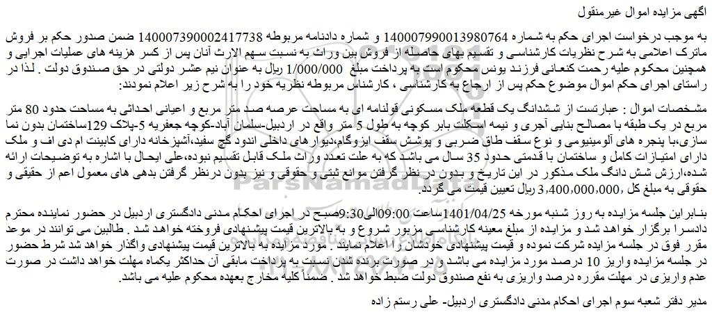 به موجب درخواست اجرای حکم به شماره 140007990013980764 و شماره دادنامه مربوطه 140007390002417738 ضمن صدور حکم بر فروش ماترک اعلامی به شرح نظریات کارشناسی و تقسیم بهای حاصله از فروش بین وراث به نسبت سهم الارث آنان پس از کسر هزینه های عملیات اجرایی و همچنین محکوم علیه رحمت کنعانی فرزند یونس محکوم است به پرداخت مبلغ 1/000/000 ریال به عنوان نیم عشر دولتی در حق صندوق دولت . لذا در راستای اجرای حکم اموال موضوع حکم پس از ارجاع به کارشناسی ، کارشناس مربوطه نظریه خود را به شرح زیر اعلام نمودند: