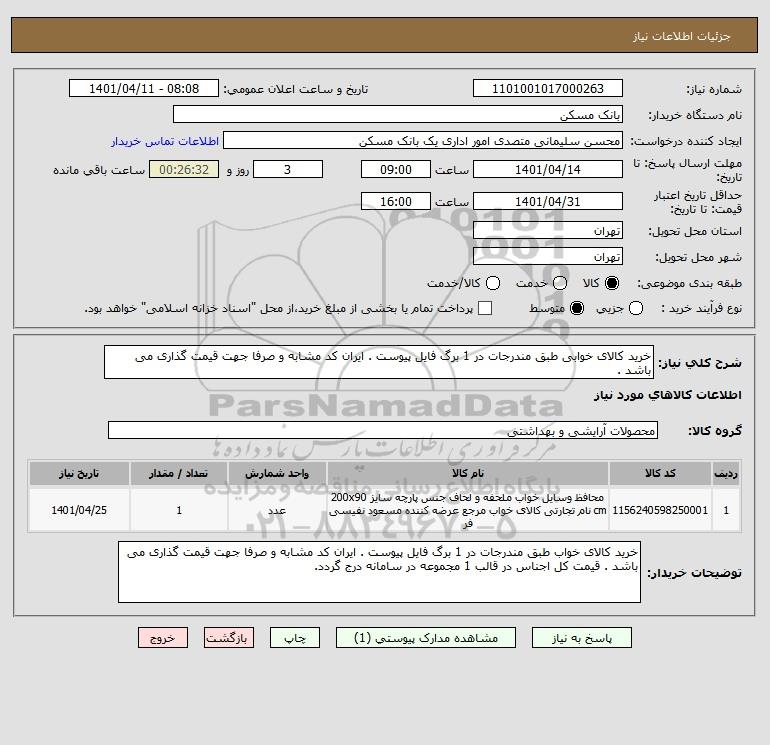 شرح کلی نیاز: خرید کالای خوابی طبق مندرجات در 1 برگ فایل پیوست . ایران کد مشابه و صرفا جهت قیمت گذاری می باشد .