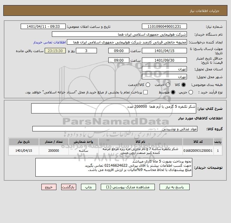 شرح کلی نیاز: شکر تکنفره 5 گرمی با آرم هما 200000 عدد