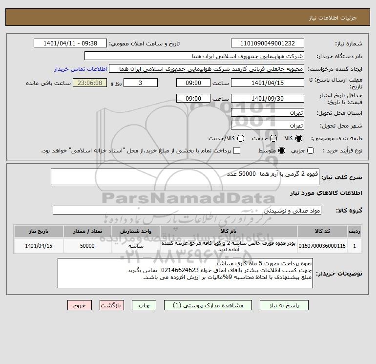 شرح کلی نیاز: قهوه 2 گرمی با آرم هما 50000 عدد