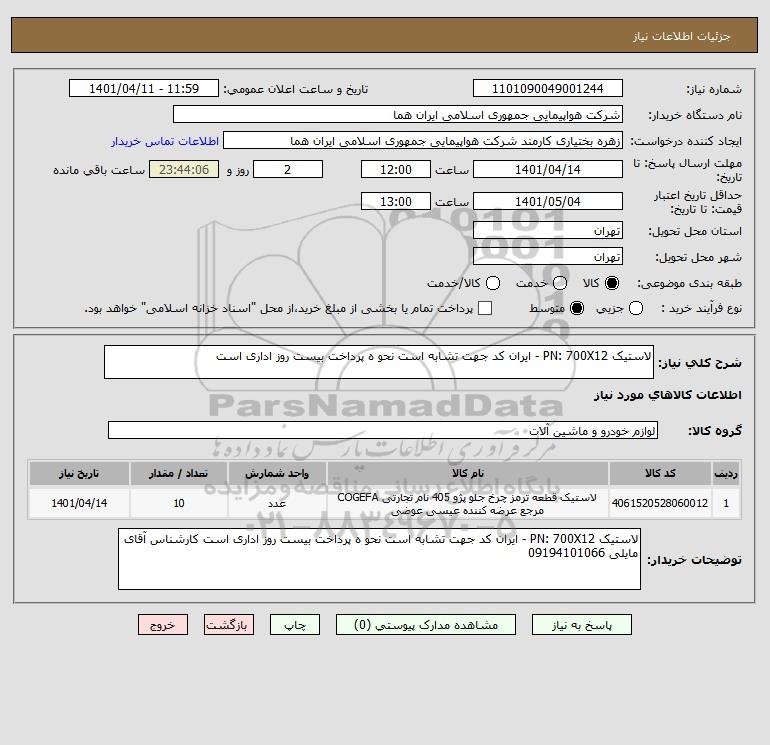 شرح کلی نیاز: لاستیک PN: 700X12 - ایران کد جهت تشابه است نحو ه پرداخت بیست روز اداری است