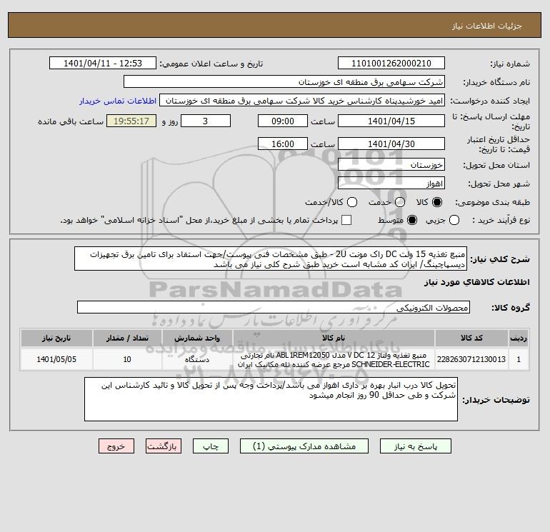 استعلام منبع تغذیه 15 ولت DC راک مونت 2U - طبق مشخصات فنی پیوست/جهت استفاد برای تامین برق تجهیزات دیسپاچینگ/ ایران کد مشابه است خرید طبق شرح کلی نیاز می باشد, استعلام منبع تغذیه 15 ولت DC راک مونت 2U - طبق مشخصات فنی پیوست/جهت استفاد برای تامین برق تجهیزات دیسپاچینگ/ ایران کد مشابه است خرید طبق شرح کلی نیاز می باشد