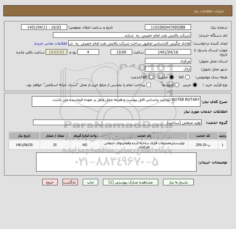 شرح کلی نیاز: OUTER ROTARY ساخت براساس فایل پیوست و هزینه حمل ونقل بر عهده فروشنده می باشد.