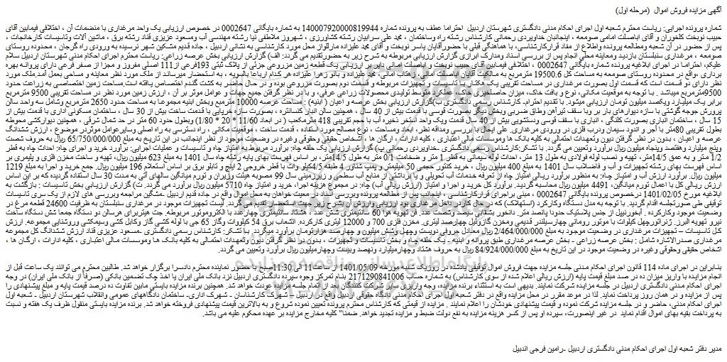 بنابراین در اجرای ماده 114 قانون اجرای احکام مدنی جلسه مزایده جهت فروش اموال توقیفی یادشده در روزیک شنبه مورخه 1401/05/09 از ساعت11 الی 11:30صبح با حضور نماینده محترم دادسرا برگزار خواهد شد. طالبین محترم می توانند یک ساعت قبل از انجام مزایده با واریز میزان ده در صد مبلغ قیمت پایه (ارزش ریالی اعلام شده از سوی کارشناس) به شماره حساب 2171290841006 بنام تمرکز وجوه سپرده دادگستری اردبیل نزد بانک ملی ایران یا اخذ چک تضمین بانکی (صرفاً از بانک ملی ایران) در وجه اجرای احکام مدنی دادگستری اردبیل در جلسه مزایده شرکت نمایند. بدیهی است به استثناء برنده مزایده، وجه واریزی سایر شرکت کنندگان بعد از اتمام جلسه مزایده عودت خواهد شد. همچنین برنده مزایده بایستی مابین تفاوت ده درصد قیمت پایه و مبلغ پیشنهادی را پس از مزایده و در همان روز پرداخت نماید. لذا در موعد مقرر در محل مزایده واقع در دفتر شعبه اول اجرای احکام مدنی دادگاه حقوقی اردبیل واقع در اردبیل – شهرک کارشناسان - شهرک اداری- ساختمان دادگاههای عمومی وانقلاب شهرستان اردبیل - شعبه اول اجرای احکام مدنی، حاضر و در جلسه مزایده شرکت نموده و قیمت پیشنهادی خودشان را اعلام نمایند . مزایده از قیمتی که کارشناس محترم پرونده تعیین نموده شروع و به بالاترین قیمت پیشنهادی فروخته خواهد شد. برنده مزایده بایستی منقول ظرف یک هفته و نسبت به پرداخت بقیه بهای اموال اقدام نماید در غیر اینصورت، سپرده او پس از کسر هزینه مزایده به نفع دولت ضبط و مزایده تجدید خواهد. ضمنا" کلیه مخارج مزایده بر عهده محکوم علیه می باشد.