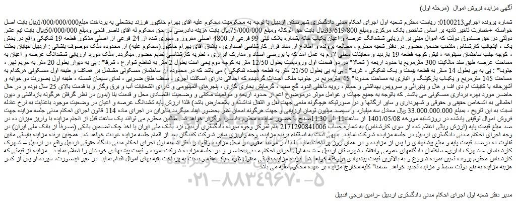 شماره پرونده اجرایی0100213: ریاست محترم شعبه اول اجرای احکام مدنی دادگستری شهرستان اردبیل با توجه به محکومیت محکوم علیه اقای بهرام خاکپور فرزند بخشعلی به پرداخت مبلغ1/000/000/000ریال بابت اصل خواسته +خسارت تاخیر تادیه بر اساس شاخص بانک مرکزی ومبلغ 33/619/800ریال بابت حق الوکاله ومبلغ 75/000/000ریال بابت هزینه دادرسی در حق محکوم له اقای ناصر فتحی ومبلغ 50/000/000ریال بابت نیم عشر دولتی در حق صندوق دولت که اموال مبنی بر ارزیابی ششدانگ عرصه و اعیان یکباب خانه بشماره پلاک ثبتی 99 فرعی از 4800 اصلی مفروز و مجزی شده از 24 فرعی از اصلی مذکور قطعه 19 تفکیکی واقع در بخش یک ، اینجانب کارشناس منتخب ضمن حضور در دفتر شعبه محترم ، مطالعه پرونده و اطلاع از مفاد قرار کارشناسی اصداری ، باتفاق آقای بهرام خاکپور(محکوم علیه) از محدوده ملک موصوف بنشانی : اردبیل خیابان بعثت ، کوچه جنب ساختمان سینوهه ، نبش کوچه قطعه 19 بازدید و معاینات محلی لازم به عمل آمد که با بررسی اسناد و مدارک ابرازی ، نظریه کارشناسی تقدیم حضور میگردد. ملک مورد ارزیابی ششدانگ عرصه و اعیان به مساحت عرصه طبق سند مالکیت 300 مترمربع با حدود اربعه ( شمالا" در دو قسمت اول ورودیست بطول 12/50 متر به کوچه دوم پخی است بطول 2 متر به تقاطع شوارع ، شرقا" : پی به دیوار بطول 20 متر به حریم نهر ، جنوبا" : پی به پی بطول 14 متر به قطعه بیست و یک تفکیکی ، غربا" : پی به پی بطول 21/50 متر به قطعه هجده تفکیکی ) می باشد که در محدوده آن ساختمان مسکونی مشتمل بر همکف و طبقه اول مسکونی هرکدام به مساحت 145 مترمربع و یکباب پارکینگ و انباری به مساحت حدودا" 45 مترمربع در جنوب ملک احداث گردیده که احداثی دارای اسکلت آجری ، سقف طاق ضربی ، نمای سیمان شسته ، طبقه اول بصورت دو خوابه و آشپزخانه با کابینت ام دی اف و هال و پذیرائی و سرویس بهداشتی و حمام ، رویه داخلی اندود گچ سفید ، گرمایش بخاری گازی ، پنجرهای آلمینیومی و دارای انشعابات آب و برق وگاز و با قدمت بالای 25 سال بوده و در حال حاضر مورد بهره برداری مسکونی می باشد. که باتوجه به جمیع جهات و عوامل موثر درموضوع اعم از حدود اربعه و موقعیت مکانی و وضعیت اقتصادی محل و قدمت بنا (بدون در نظر گرفتن هرگونه بازداشتی و دیون احتمالی به اشخاص حقیقی و حقوقی و شهرداری و سایر ارگانها و در صورتیکه هیچگونه منعی جهت نقل و انتقال نداشته و بلامعارض باشد) فلذا ارزش پایه ششدانگ عرصه و اعیان در وضعیت موجود باعنایت به نرخ عادله نسبت به این تاریخ ، بمبلغ 33.000.000.000 ریال معادل سه میلیارد و سیصد میلیون تومان ارزیابی و جهت هرگونه امعان نظر بحضور ایفاد میگردد.بنابراین در اجرای ماده 114 قانون اجرای احکام مدنی جلسه مزایده جهت فروش اموال توقیفی یادشده در روزشنبه مورخه 1401/05/08 از ساعت11 الی 11:30صبح با حضور نماینده محترم دادسرا برگزار خواهد شد. طالبین محترم می توانند یک ساعت قبل از انجام مزایده با واریز میزان ده در صد مبلغ قیمت پایه (ارزش ریالی اعلام شده از سوی کارشناس) به شماره حساب 2171290841006 بنام تمرکز وجوه سپرده دادگستری اردبیل نزد بانک ملی ایران یا اخذ چک تضمین بانکی (صرفاً از بانک ملی ایران) در وجه اجرای احکام مدنی دادگستری اردبیل در جلسه مزایده شرکت نمایند. بدیهی است به استثناء برنده مزایده، وجه واریزی سایر شرکت کنندگان بعد از اتمام جلسه مزایده عودت خواهد شد. همچنین برنده مزایده بایستی مابین تفاوت ده درصد قیمت پایه و مبلغ پیشنهادی را پس از مزایده و در همان روز پرداخت نماید. لذا در موعد مقرر در محل مزایده واقع در دفتر شعبه اول اجرای احکام مدنی دادگاه حقوقی اردبیل واقع در اردبیل – شهرک کارشناسان - شهرک اداری- ساختمان دادگاههای عمومی وانقلاب شهرستان اردبیل - شعبه اول اجرای احکام مدنی، حاضر و در جلسه مزایده شرکت نموده و قیمت پیشنهادی خودشان را اعلام نمایند . مزایده از قیمتی که کارشناس محترم پرونده تعیین نموده شروع و به بالاترین قیمت پیشنهادی فروخته خواهد شد. برنده مزایده بایستی منقول ظرف یک هفته و نسبت به پ