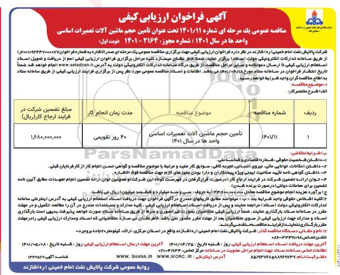 مناقصه عمومی یک مرحله ای شماره 1401/11 تحت عنوان تامین حجم ماشین آلات تعمیرات اساسی واحدها در سال 1401 شماره مجوز 2164- 1401 نوبت اول