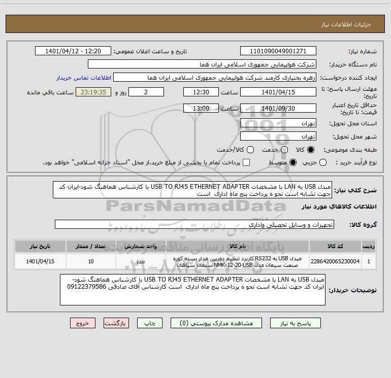 شرح کلی نیاز: مبدل USB به LAN با مشخصات USB TO RJ45 ETHERNET ADAPTER با کارشناس هماهنگ شود-ایران کد جهت تشابه است نحو ه پرداخت پنج ماه اداری است