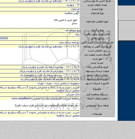 این مناقصه در تاریخ 1401/04/13 شروع و مهلت آن تا تاریخ 1401/04/20 میباشد.