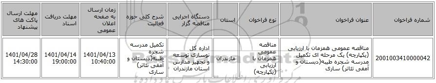 | 2001003410000042 | مناقصه عمومی همزمان با ارزیابی (یکپارچه) یک مرحله ای تکمیل مدرسه شجره طیبه(دبستان و آمفی تئاتر) ساری | مناقصه عمومی همزمان با ارزیابی (یکپارچه) | مازندران | اداره کل نوسازی توسعه و تجهیز مدارس استان مازندران | تکمیل مدرسه شجره طیبه(دبستان و آمفی تئاتر) ساری | 1401/04/13 10:40:00 | 1401/04/14 19:00:00 | 1401/04/28 14:30:00 |
