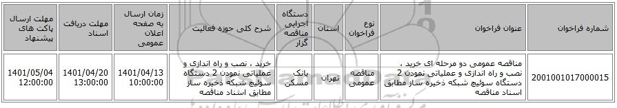 2001001017000015مناقصه عمومی دو مرحله ای خرید ، نصب و راه اندازی و عملیاتی نمودن 2 دستگاه سوئیچ شبکه ذخیره ساز مطابق اسناد مناقصه مناقصه عمومیتهرانبانک مسکنخرید ، نصب و راه اندازی و عملیاتی نمودن 2 دستگاه سوئیچ شبکه ذخیره ساز مطابق اسناد مناقصه 1401/04/13 10:00:001401/04/20 13:00:001401/05/04 12:00:00