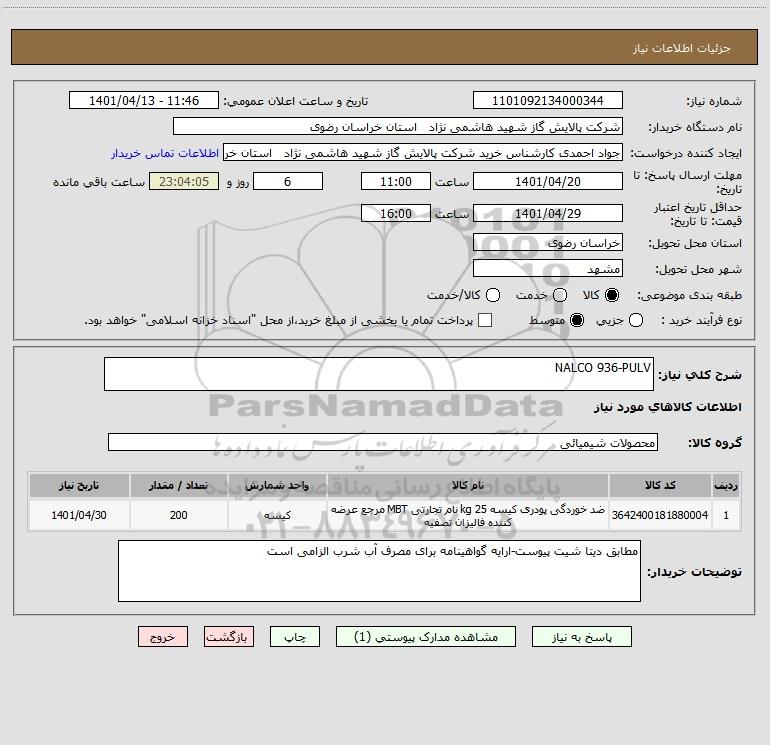 شرح کلی نیاز: NALCO 936-PULV