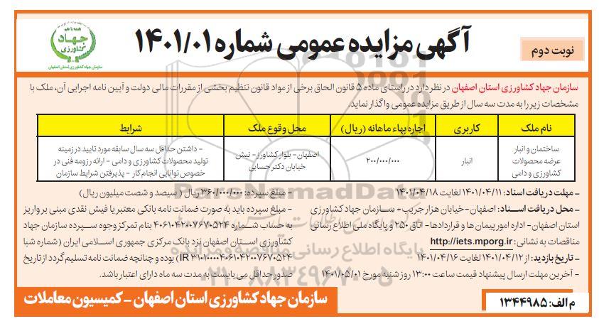 سازمان جهاد کشاورزی استان اصفهان در نظر دارد در راستای ماده 5 قانون الحاقی برخی مواد به قانون تنظیم بخشی از مقررات مالی دولت و آیین نامه اجرایی آن، ملک با مشخصات زیر حداکثر به مدت سه سال از طریق مزایده عمومی واگذار نماید.