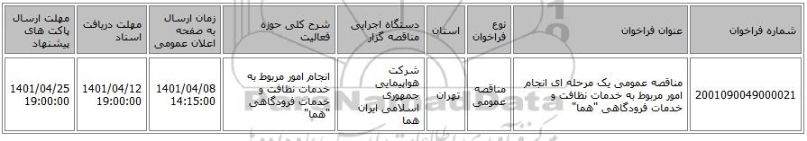مناقصه، مناقصه عمومی یک مرحله ای انجام امور مربوط به خدمات نظافت و خدمات فرودگاهی "هما" از کلیه افراد متخصص و شرکت‌ها واجد شرایط دعوت به عمل می‌آید در مناقصه با کد خبرگزاری پارس نماد: 4689274 شرکت نمایند. این مناقصه در تاریخ 1401/04/14 شروع و مهلت آن تا تاریخ 1401/04/12 میباشد.