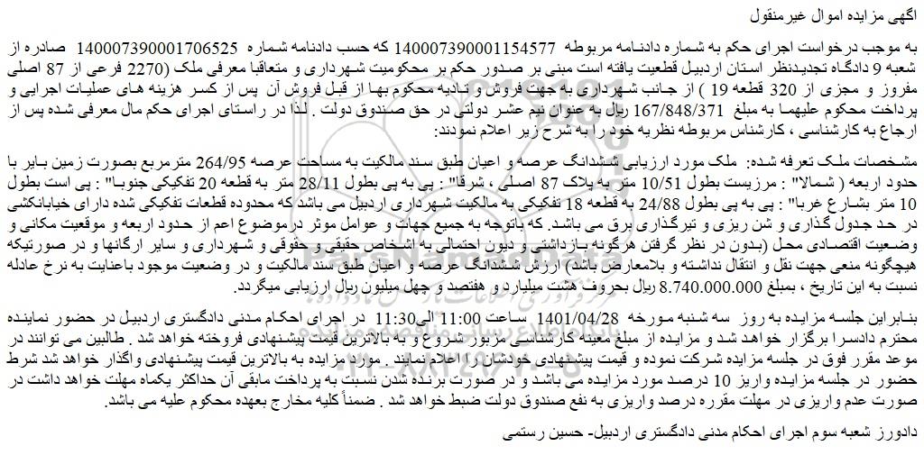 به موجب درخواست اجرای حکم به شماره دادنامه مربوطه 140007390001154577 که حسب دادنامه شماره 140007390001706525 صادره از شعبه 9 دادگاه تجدیدنظر استان اردبیل قطعیت یافته است مبنی بر صدور حکم بر محکومیت شهرداری و متعاقبا معرفی ملک (2270 فرعی از 87 اصلی مفروز و مجزی از 320 قطعه 19 ) از جانب شهرداری به جهت فروش و تادیه محکوم بها از قبل فروش آن پس از کسر هزینه های عملیات اجرایی و پرداخت محکوم علیهما به مبلغ 167/848/371 ریال به عنوان نیم عشر دولتی در حق صندوق دولت . لذا در راستای اجرای حکم مال معرفی شده پس از ارجاع به کارشناسی ، کارشناس مربوطه نظریه خود را به شرح زیر اعلام نمودند: