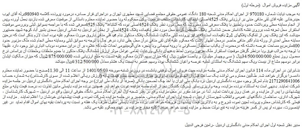 به موجب نیابت شماره 970180 از اجرای احکام مدنی شعبه 180 دادگاه عمومی حقوقی مجتمع قضایی شهید مطهری تهران و دراجرای قرار صادره درمورد پرونده کلاسه 980940برله آقای ایوب حیدرخانی علیه اقای تقی منافی مبنی بر ارزیابی پلاک 4525اصلی اینجانب کارشناس منتخب درمعیت وکیل محکوم له وبا حضور نماینده محترم داستانی از موقعیت معرفی شده بازدید بعمل آورده وپس از انجام معاینه محلی وبرداشت حدود وتطبیق با پلاک معرفی شده معلوم شد که محل مورد نظر پلاک 4524اصلی بوده که اشتباها" پلاک 4525معرفی شده که با مراجعه بسوابق ثبتی وبررسی موقعیت استقرار محل تعرفه شده برروی نقشه کاداستر ضمن شناسائی پلاک مشخص گردید محل مورد نظر باقیمانده پلاک 4524اصلی از بخش دو اردبیل به نشانی اردبیل سعدی بشیر آباد کوچه شهید حسنپور میباشد که این پلاک پس از تفکیک پلاکهای 1و2 باقیمانده است که برابر پرونده ثبتی مالکیت ششدانگ پلاک مذکور بنام محمد قلی منافی باروق مورث محکوم علیه بوده است لازم بذکر است که درحین معاینه محلی احدی از ورثه بنام اکبر منافی حاضر درمحل اظهار داشت که محکوم علیه آقای تقی منافی درآن محل حقی ندارد درهر حال با توجه به سوابق ثبتی ومعاینه محلی انجام شده ملک مزبور حدود 400مترمربع مساحت عرصه داشته که درمحدوده آن یکباب ساختمان مسکونی با رویه سیمانی وبا پنجره های آلومینیومی احداث شده که علاوه بر آن دراین محدوده دوباب انباری نیز وجود دارد علیهذا با توجه به مراتب فوق وبا درنظر گرفتن موقعیت استقرار ملک مزبور وبدون لحاظ بدهیهای بانکی ورعایت تمامی عوامل موثر ارزش ششدانگ پلاک مذکور با جمیع متعلقات وملحقات آن براساس نرخ معمول روز بمبلغ 34/500/000/000ریال ( سی وچهار میلیارد و پانصد میلیون ریال ) که میزان سهم الارث محکوم علیه نسبت به مبلغ ارزیابی شده 2/875/000/000ریال که میزان مالکیت ایشان برابر دوسهم مشاع از بیست ویک سهم ششدانگ به استثنای ثمنیه عرصه واعیان ششدانگ بوده وسهم همسر به نسبت یک هشتم معادل 4/312/500/000ریال میباشد