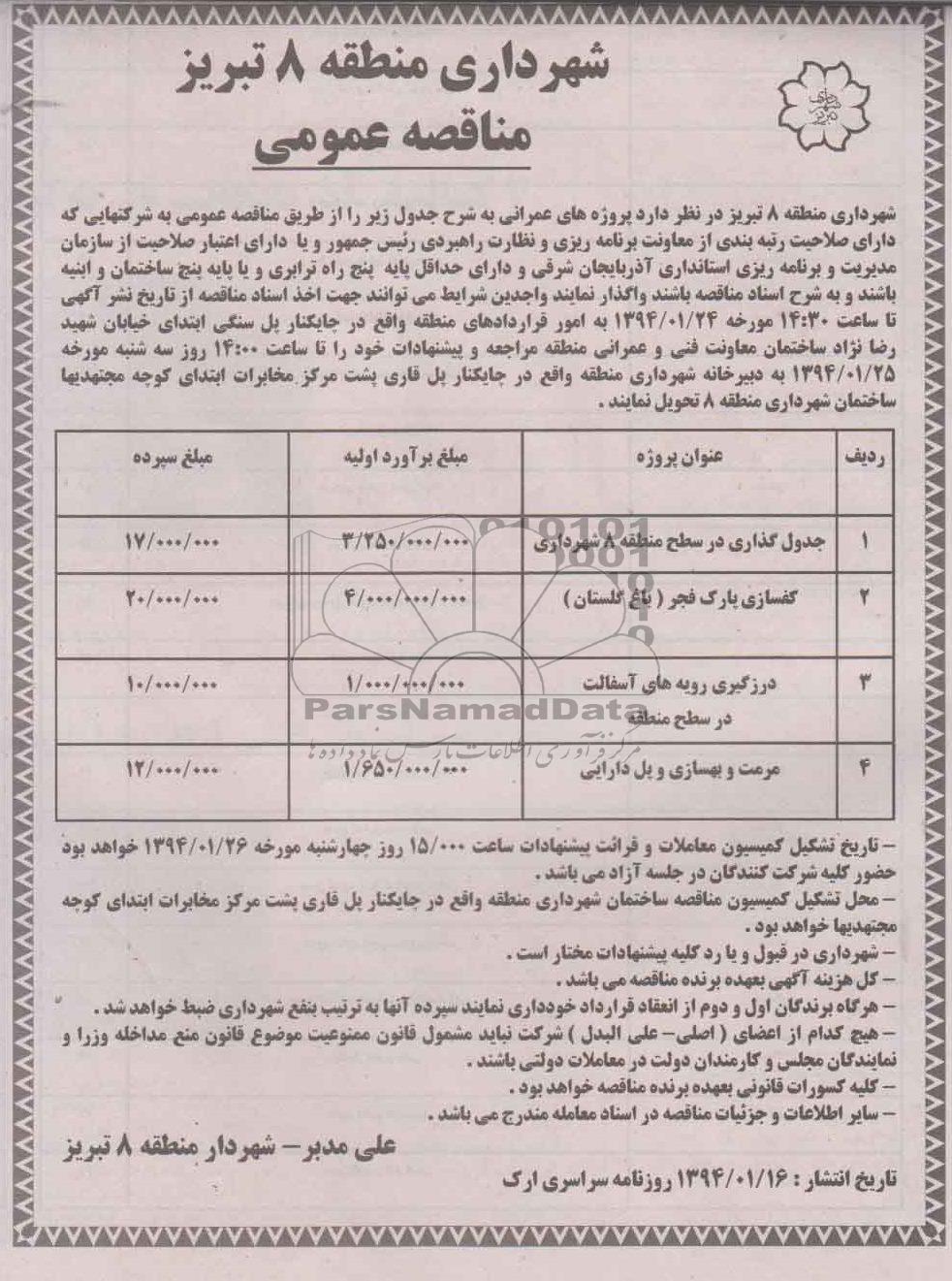 شهرداری منطقه 8 تبریز در نظر دارد پروژه های عمرانی به شرح جدول زیر از طریق مناقصه عمومی به شرکتهایی که دارای صلاحیت رتبه بندی از معاونت برنامه ریزی و نظارت راهبردی رئیس جمهور و یا دارای اعتبار صلاحیت از سازمان مدیریت و برنامه ریزی استانداری آذربایجان شرقی و دارای حداقل پایه پنج راه ترابری و یا پایه پنج ساختمان و ابنیه باشند و به شرح اسناد مناقصه باشند واگذار نمایند. واجدین شرایط می توانند جهت اخذ اسناد مناقصه از تاریخ نشر آگهی تا ساعت 14:30 مورخ 94.1.24 به امور قراردادهای منطقه واقع در چایکنار پل سنگی ابتدای خیابان شهید رضانژاد ساختمان معاونت فنی و عمرانی منطقه مراجعه و پیشنهادات خود را تا ساعت 14 روز سه شنبه مورخ 94.1.25 به دبیرخانه شهرداری منطقه واقع در چایکنار پل قاری پشت مرکز مخابرات ابتدای کوچه مجتهدیها ساختمان شهرداری منطقه 8 تحویل نمایند.