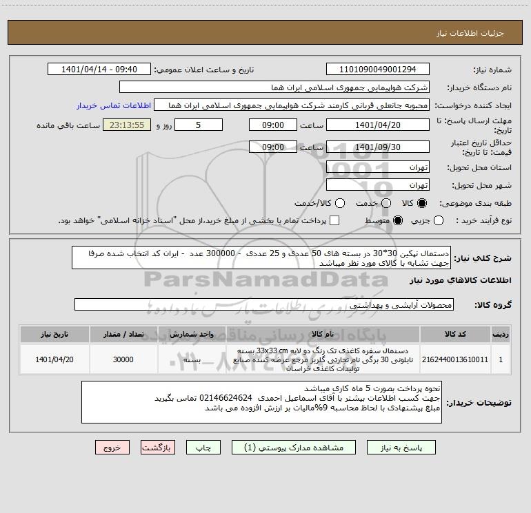 شرح کلی نیاز: دستمال نپکین 30*30 در بسته های 50 عددی و 25 عددی - 300000 عدد - ایران کد انتخاب شده صرفا جهت تشابه با کالای مورد نظر میباشد