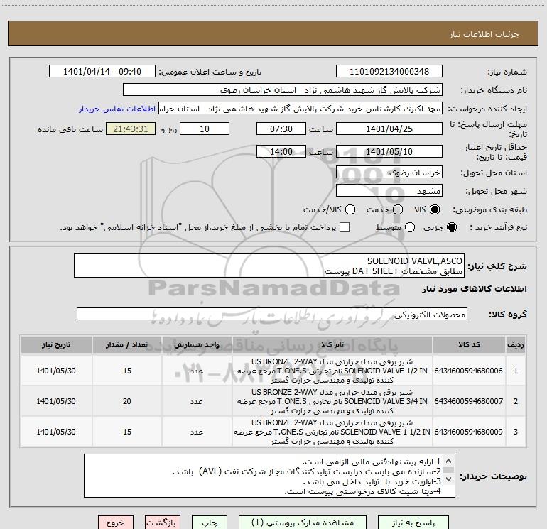 نام دستگاه خریدار:شرکت پالایش گاز شهید هاشمی نژاد استان خراسان رضوی
