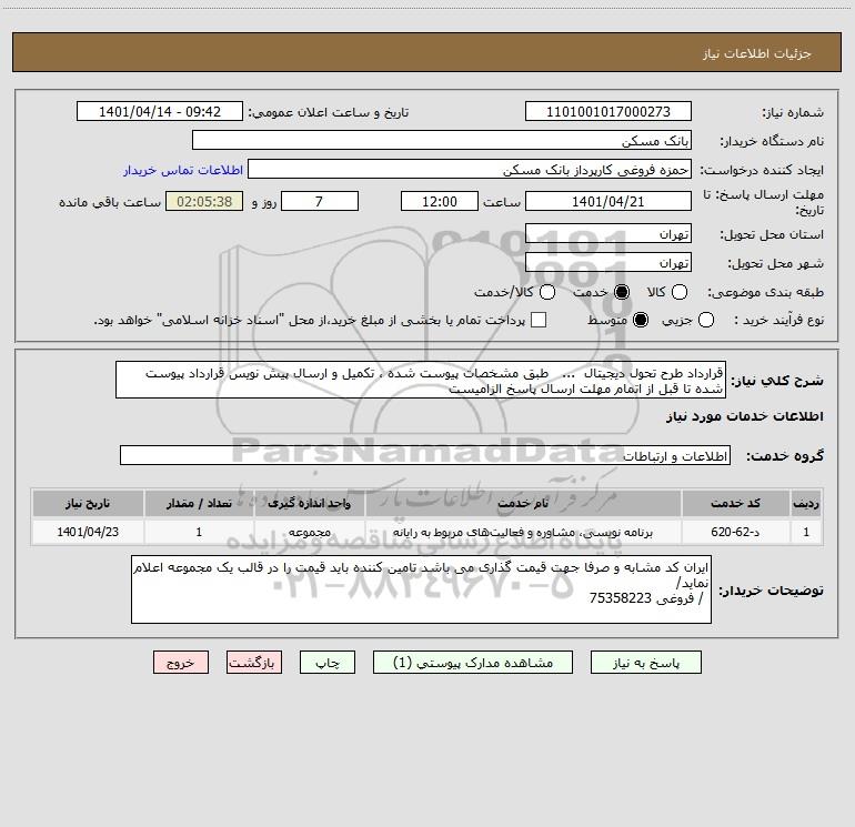 شرح کلی نیاز: قرارداد طرح تحول دیجیتال ... طبق مشخصات پیوست شده ، تکمیل و ارسال پیش نویس قرارداد پیوست شده تا قبل از اتمام مهلت ارسال پاسخ الزامیست