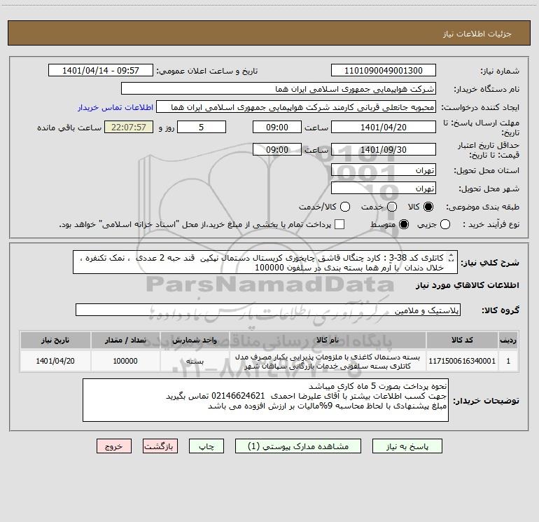 شرح کلی نیاز: کاتلری کد 38-3 : کارد چنگال قاشق چایخوری کریستال دستمال نپکین قند حبه 2 عددی ، نمک تکنفره ، خلال دندان با آرم هما بسته بندی در سلفون 100000
