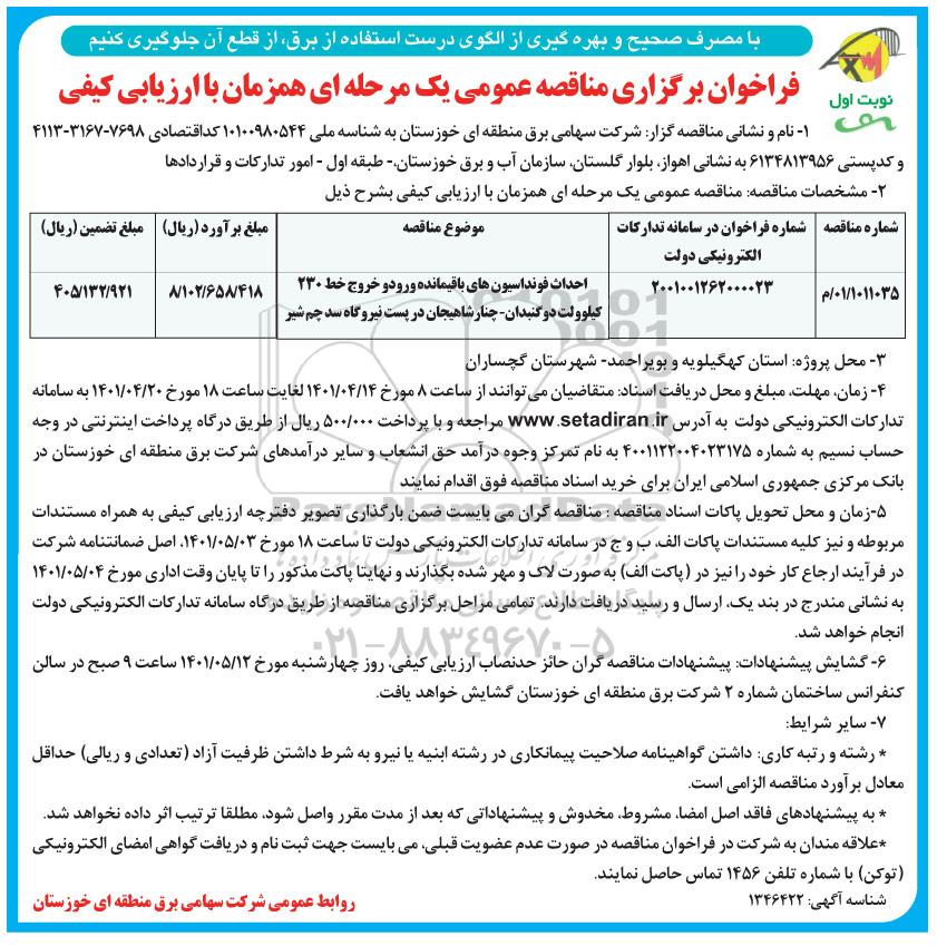 | 1011035/ 01/ م | 2001001262000023 | احداث فونداسیون های باقیمانده ورود و خروج خط 230 کیلوولت دوگنبدان - چنار شاهیجان در پست نیروگاه سد چم شیر | 8.102.658.418 | 405.132.921 |