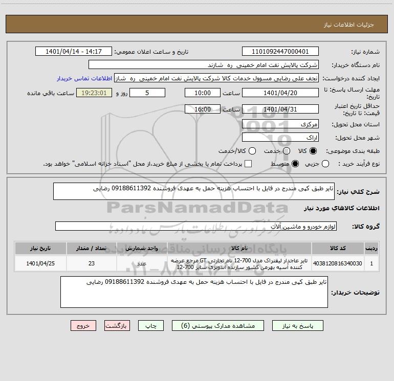 شرح کلی نیاز: تایر طبق کپی مندرج در فایل با احتساب هزینه حمل به عهدی فروشنده 09188611392 رضایی