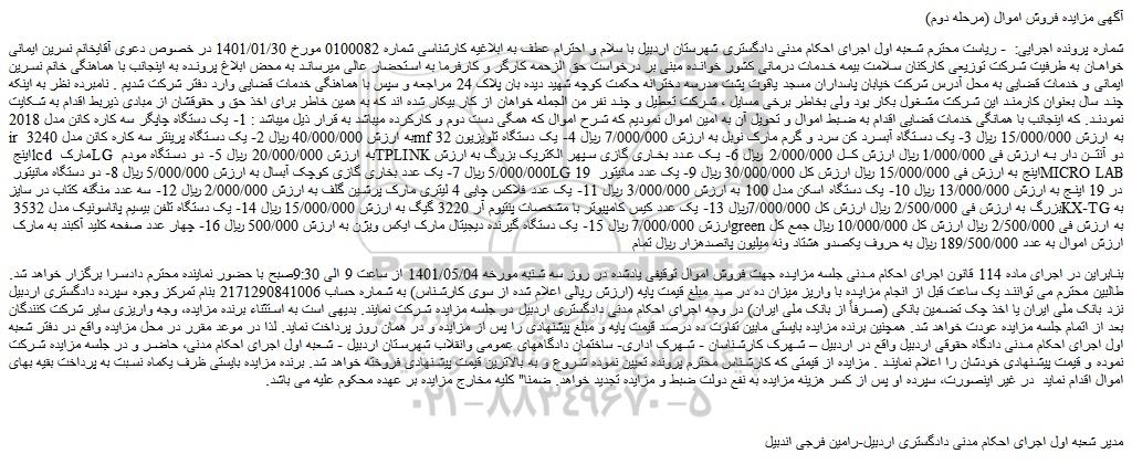 شماره پرونده اجرایی: - ریاست محترم شعبه اول اجرای احکام مدنی دادگستری شهرستان اردبیل با سلام و احترام عطف به ابلاغیه کارشناسی شماره 0100082 مورخ 1401/01/30 در خصوص دعوی آقایخانم نسرین ایمانی خواهان به طرفیت شرکت توزیعی کارکنان سلامت بیمه خدمات درمانی کشور خوانده مبنی بر درخواست حق الزحمه کارگر و کارفرما به استحضار عالی میرساند به محض ابلاغ پرونده به اینجانب با هماهنگی خانم نسرین ایمانی و خدمات قضایی به محل آدرس شرکت خیابان پاسداران مسجد یاقوت پشت مدرسه دخترانه حکمت کوچه شهید دیده بان پلاک 24 مراجعه و سپس با هماهنگی خدمات قضایی وارد دفتر شرکت شدیم . نامبرده نظر به اینکه چند سال بعنوان کارمند این شرکت مشغول بکار بود ولی بخاطر برخی مسایل ، شرکت تعطیل و چند نفر من الجمله خواهان از کار بیکار شده اند که به همین خاطر برای اخذ حق و حقوقشان از مبادی ذیربط اقدام به شکایت نمودند. که اینجانب با همانگی خدمات قضایی اقدام به ضبط اموال و تحویل آن به امین اموال نمودیم که شرح اموال که همگی دست دوم و کارکرده میباشد به قرار ذیل میباشد : 1- یک دستگاه چاپگر سه کاره کانن مدل 2018 ir به ارزش 40/000/000 ریال 2- یک دستگاه پرینتر سه کاره کانن مدل 3240 mf به ارزش 15/000/000 ریال 3- یک دستگاه آبسرد کن سرد و گرم مارک نوبل به ارزش 7/000/000 ریال 4- یک دستگاه تلویزیون 32 اینج lcd مارک LG به ارزش 20/000/000 ریال 5- دو دستگاه مودم TPLINK دو آنتن دار به ارزش فی 1/000/000 ریال ارزش کل 2/000/000 ریال 6- یک عدد بخاری گازی سپهر الکتریک بزرگ به ارزش 5/000/000 ریال 7- یک عدد بخاری گازی کوچک آبسال به ارزش 5/000/000 ریال 8- دو دستگاه مانیتور LG 19 اینج به ارزش فی 15/000/000 ریال ارزش کل 30/000/000 ریال 9- یک عدد مانیتور MICRO LAB در 19 اینج به ارزش 13/000/000 ریال 10- یک دستگاه اسکن مدل 100 به ارزش 3/000/000 ریال 11- یک عدد فلاکس چایی 4 لیتری مارک پرشین گلف به ارزش 2/000/000 ریال 12- سه عدد منگنه کتاب در سایز بزرگ به ارزش فی 2/500/000 ریال ارزش کل 7/000/000ریال 13- یک عدد کیس کامپیوتر با مشخصات پنتیوم آر 3220 گیگ به ارزش 15/000/000 ریال 14- یک دستگاه تلفن بیسیم پاناسونیک مدل 3532 KX-TG به ارزش 7/000/000 ریال 15- یک دستگاه گیرنده دیجیتال مارک ایکس ویژن به ارزش 500/000 ریال 16- چهار عدد صفحه کلید آکبند به مارک green به ارزش فی 2/500/000 ریال ارزش کل 10/000/000 ریال جمع کل ارزش اموال به عدد 189/500/000 ریال به حروف یکصدو هشتاد ونه میلیون پانصدهزار ریال تمام