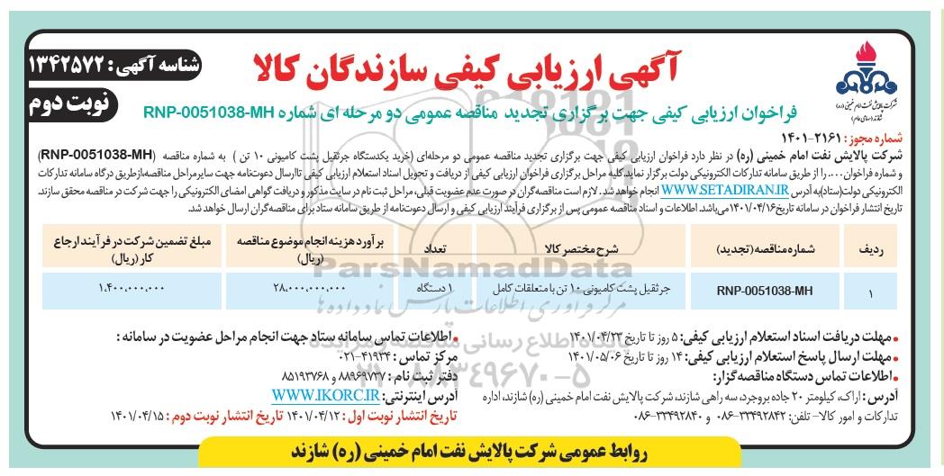 شرکت پالایش نفت امام خمینی (ره) در نظر دارد فراخوان ارزیابی کیفی جهت برگزاری تجدید مناقصه عمومی دو مرحله ای (خرید یک دستگاه جرثقیل پشت کامیونی 10 تن) به شماره مناقصه (RNP- 0051038-MH) و شماره فراخوان ... را از طریق سامانه تدارکات الکترونیکی دولت برگزار نماید. کلیه مراحل برگزاری فراخوان ارزیابی کیفی از دریافت و تحویل اسناد استعلام ارزیابی کیفی تا ارسال دعوتنامه جهت سایر مراحل مناقصه از طریق درگاه سامانه تدارکات الکترونیکی دولت ستاد به آدرس ستاد ایران انجام خواهد شد. لازم است مناقصه گران در صورت عدم عضویت قبلی مراحل ثبت نام در سایت مذکور و دریافت گواهی امضای الکترونیکی را جهت شرکت در مناقصه محقق سازند. تاریخ انتشار فراخوان در سامانه تاریخ 1401.4.16 می باشد. اطلاعات و اسناد مناقصه عمومی پس از برگزاری فرآیند ارزیابی کیفی و ارسال دعوتنامه از طریق سامانه ستاد به مناقصه گران ارسال خواهد شد.