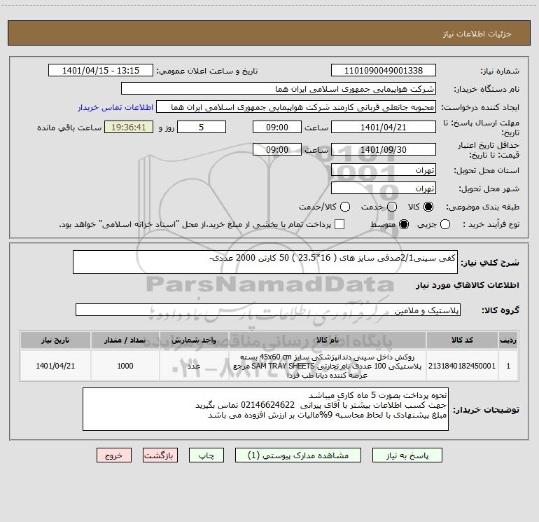 شرح کلی نیاز: کفی سینی2/1صدفی سایز های ( 16*23.5 ) 50 کارتن 2000 عددی-