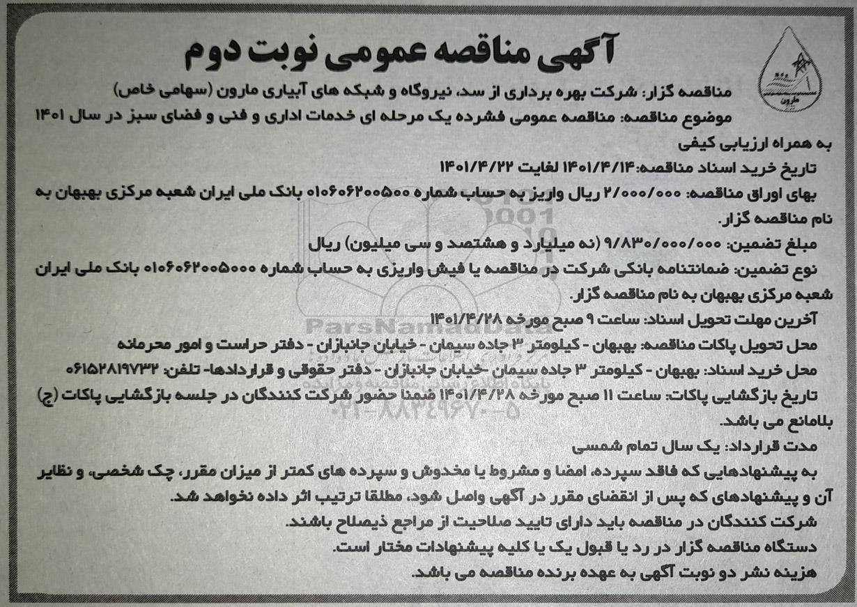 مناقصه عمومی خدمات اداری و فنی و فضای سبز در سال 1401 - نوبت دوم از کلیه افراد متخصص و شرکتها واجد شرایط دعوت به عمل میآید در مناقصه با کد خبرگزاری پارس نماد: 4697686 شرکت نمایند.