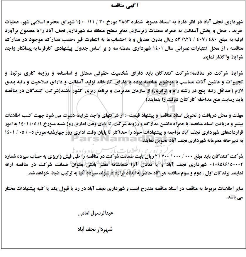 شهرداری نجف آباد به استناد مصوبه شماره 1400/2853 مورخ 1400.11.30 شورای محترم اسلامی شهر، عملیات خرید، حمل و پخش آسفالت به همراه عملیات زیرسازی معابر سطح منطقه سه شهرداری نجف آباد را با مجموع برآورد تقریبی اولیه به مبلغ 53.629.407.480 ریال بدون تعدیل و با احتساب مابه التفاوت قیمت قیر ، حسب مدارک موجود در مدارک مناقصه از محل اعتبارات عمرانی سال 1401 شهرداری و براساس فهرست بها سال 1401 به پیمانکار واجد شرایط واگذار نماید