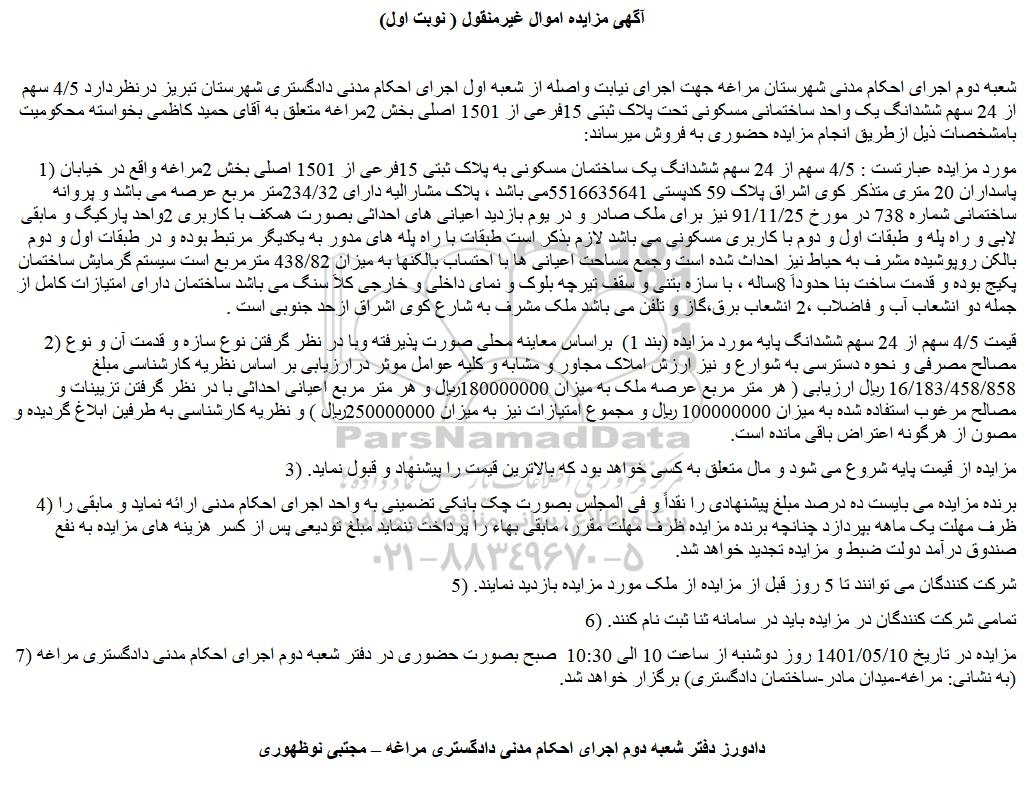 شعبه دوم اجرای احکام مدنی شهرستان مراغه جهت اجرای نیابت واصله از شعبه اول اجرای احکام مدنی دادگستری شهرستان تبریز درنظردارد 4/5 سهم از 24 سهم ششدانگ یک واحد ساختمانی مسکونی تحت پلاک ثبتی 15فرعی از 1501 اصلی بخش 2مراغه متعلق به آقای حمید کاظمی بخواسته محکومیت بامشخصات ذیل ازطریق انجام مزایده حضوری به فروش میرساند: