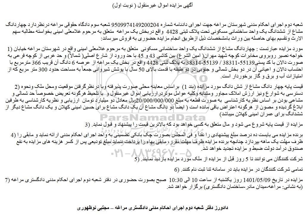 شعبه دوم اجرای احکام مدنی شهرستان مراغه جهت اجرای دادنامه شماره 9509974149200204 شعبه سوم دادگاه حقوقی مراغه درنظردارد چهاردانگ مشاع از ششدانگ یک واحد ساختمانی مسکونی تحت پلاک ثبتی 4428 واقع دربخش یک مراغه متعلق به مرحوم غلامعلی امینی بخواسته مطالبه سهم الارث وتقسیم بهای حاصله بین وراث بامشخصات ذیل ازطریق انجام مزایده حضوری به فروش میرساند: