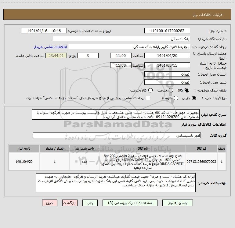 استعلام تجهیزات موتورخانه ای-کد کالا مشابه است- طبق مشخصات فایل و لیست پیوست-در صورت هرگونه سوال با شماره تلفن 09124020780 آقای عبدی تماس حاصل فرمایید., استعلام تجهیزات موتورخانه ای-کد کالا مشابه است- طبق مشخصات فایل و لیست پیوست-در صورت هرگونه سوال با شماره تلفن 09124020780 آقای عبدی تماس حاصل فرمایید.