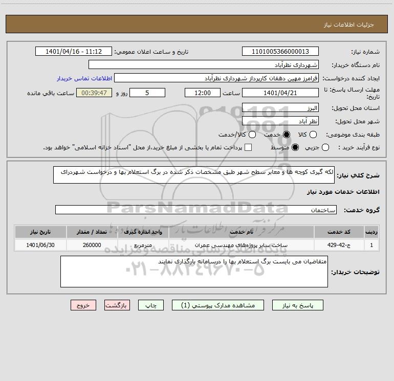 استعلام بها و موضوع استعلام استعلام لکه گیری کوچه ها و معابر سطح شهر طبق مشخصات ذکر شده در برگ استعلام بها و درخواست شهردرای به اطلاع کلیه شرکتها و افراد متخصص واجد شرایط میرساند، آگهی گذار در نظر دارد از طریق استعلام بها، نسبت به انتخاب و دریافت پیشنهادات اقدام نماید. این استعلام با کد آگهی ثبت شده در سامانه خبرگزاری پارس نماد : 4700762 منتشر شده است. مشخصات استعلام : تاریخ شروع استعلام: 1401/04/16 آخرین مهلت ارسال پیشنهاد قیمت : 1401/04/21 و محل اجرای پروژه : استان البرز میباشد. استعلام قیمت مورد درخواست : استعلام لکه گیری کوچه ها و معابر سطح شهر طبق مشخصات ذکر شده در برگ استعلام بها و درخواست شهردرای با دستهبندیهای تخصصی و گروه های مرتبط : راهسازی, ساختمان, استعلام اطلاع رسانی میگردد.