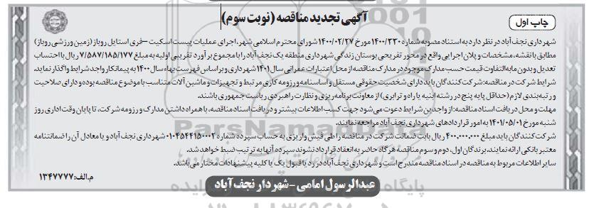شهرداری نجف آباد به استناد مصوبه شماره 1400/330 مورخ 1400.2.27 شورای محترم اسلامی شهر، اجرای عملیات پیست اسکیت - فری استایل روباز ( زمین ورزشی روباز ) مطابق با نقشه مشخصات و پلان اجرایی واقع در محور تفریحی بوستان زندگی شهرداری منطقه یک نجف آباد را با مجموع براورد تقریبی اولیه به مبلغ 7.587.185.177 ریال با احتساب تعدیل و بدون مابه تفاوت قیمت حسب مدارک موجود در مدارک مناقصه از محل اعتبارات عمرانی سال 1401 شهرداری و براساس فهرست بها سال 1400 به پیمانکار واجد شرایط واگذار نماید.