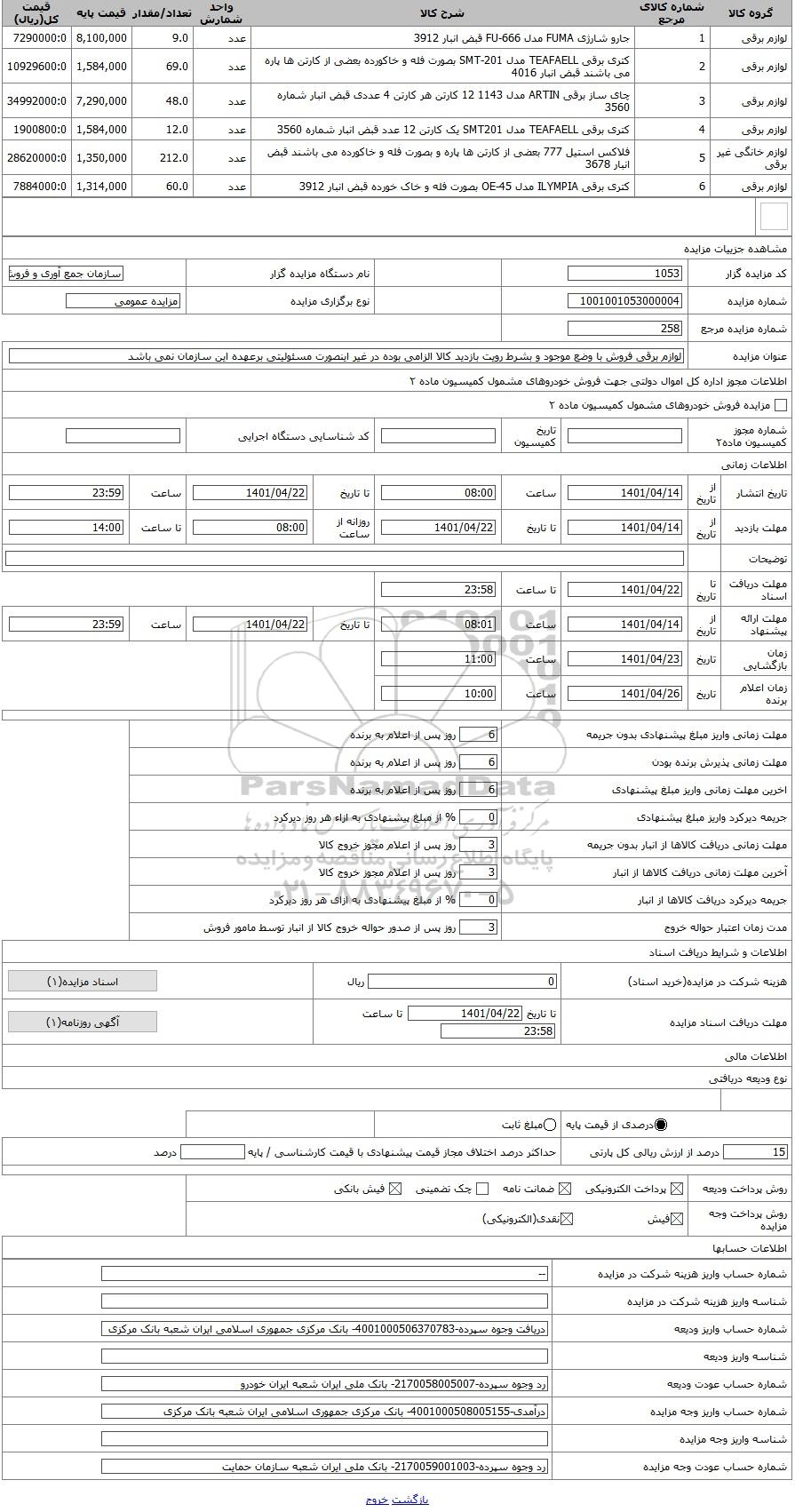 کد مزایده گزار1053نام دستگاه مزایده گزارسازمان جمع آوری و فروش اموال تملیکی