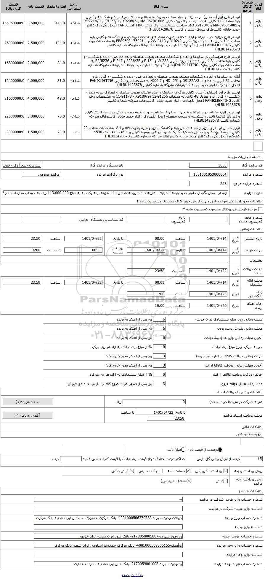 مزایده ، لوستر - محل نگهداری انبار جدید پایانه کانتینری - هزینه های مربوطه شامل : 1 - هزینه بیمه یکساله به مبلغ 113.000.000 ریال, مزایده ، لوستر - محل نگهداری انبار جدید پایانه کانتینری - هزینه های مربوطه شامل : 1 - هزینه بیمه یکساله به مبلغ 113.000.000 ریال