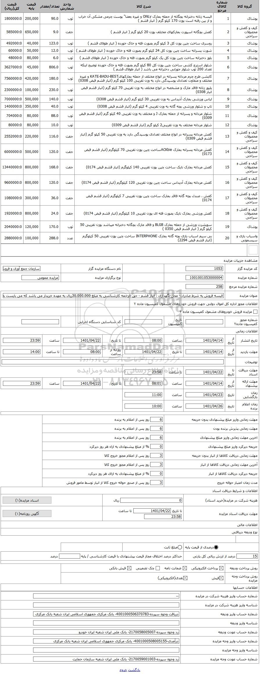 مزایده ، البسه فروش به شرط صادرات- محل نگهداری : انبار قشم - حق الزحمه کارشناسی به مبلغ 30.000.000ریال به عهده خریدار می باشد که