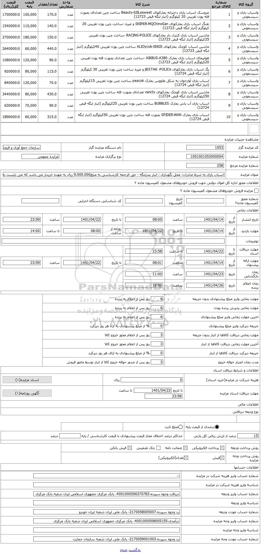 مزایده عمومی مزایده ، اسباب بازی به شرط صادرات- محل نگهداری : انبار بندرلنگه - حق الزحمه کارشناسی به مبلغ9.000.000 ریال به عهده خریدار می باش برگزار میگردد. از کلیه افراد متخصص و شرکتهای واجد شرایط دعوت به عمل میآید تا در این مزایده با کد خبرگزاری پارس نماد : 4702111 شرکت نمایند تاریخ شروع مزایده : 1401/04/14 مهلت شرکت در مزایده: تا پایان روز 1401/04/22