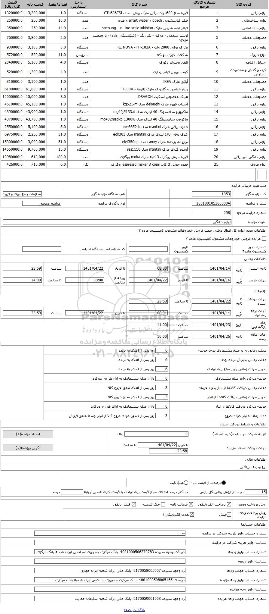 کد مزایده گزار | 1053 | نام دستگاه مزایده گزار | سازمان جمع آوری و فروش اموال تملیکی | |