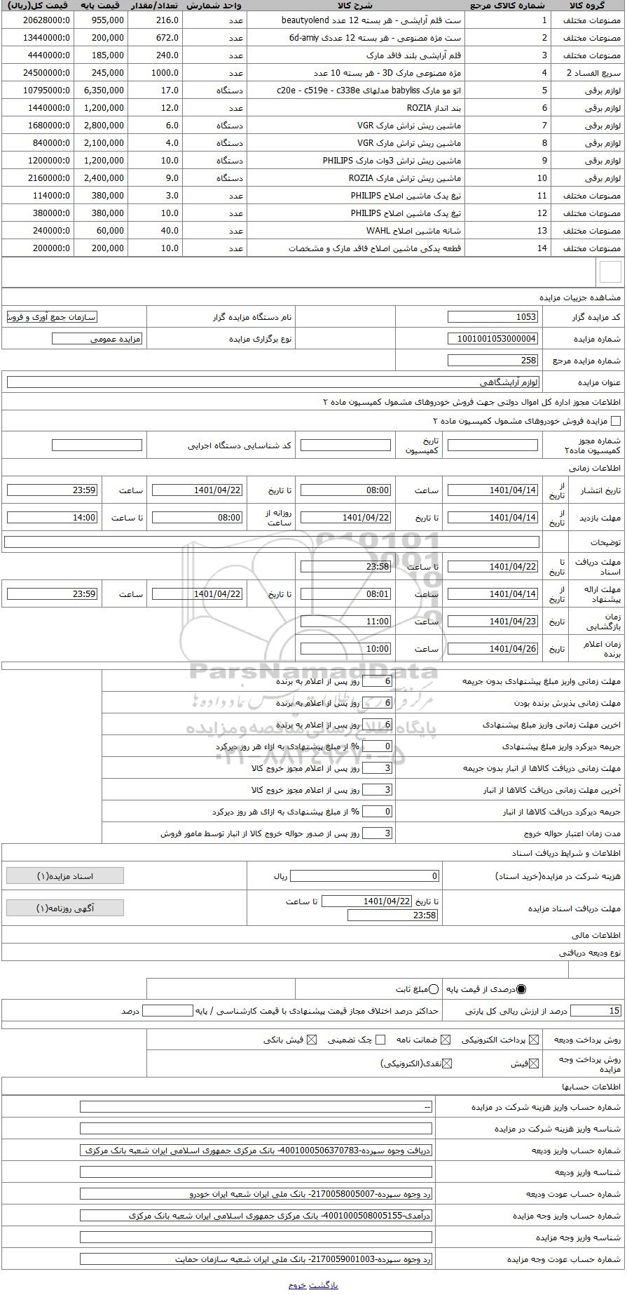 مزایده عمومی مزایده ، لوازم آرایشگاهی برگزار میگردد. از کلیه افراد متخصص و شرکتهای واجد شرایط دعوت به عمل میآید تا در این مزایده با کد خبرگزاری پارس نماد : 4702170 شرکت نمایند تاریخ شروع مزایده : 1401/04/14 مهلت شرکت در مزایده: تا پایان روز 1401/04/22