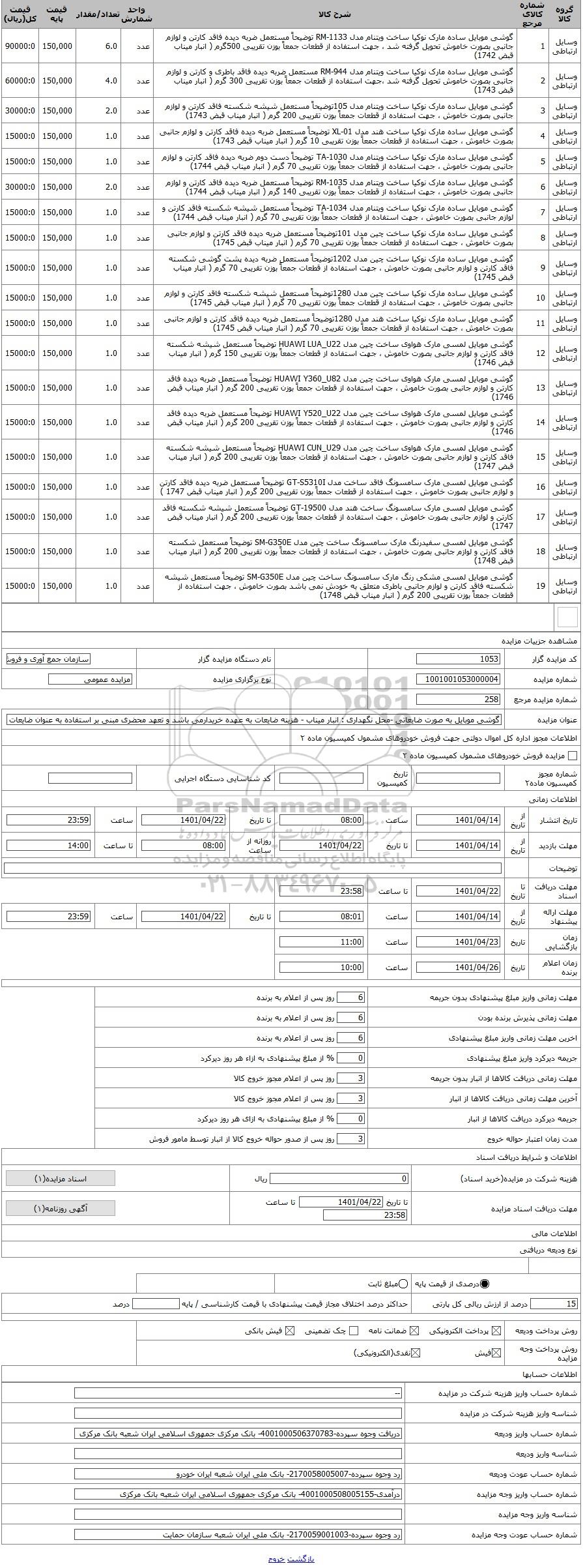 مزایده عمومی مزایده ، گوشی موبایل به صورت ضایعاتی -محل نگهداری : انبار میناب - هزینه ضایعات به عهده خریدارمی باشد و تعهد محضری مبنی بر استفاد برگزار میگردد. از کلیه افراد متخصص و شرکتهای واجد شرایط دعوت به عمل میآید تا در این مزایده با کد خبرگزاری پارس نماد : 4702331 شرکت نمایند تاریخ شروع مزایده : 1401/04/14 مهلت شرکت در مزایده: تا پایان روز 1401/04/22