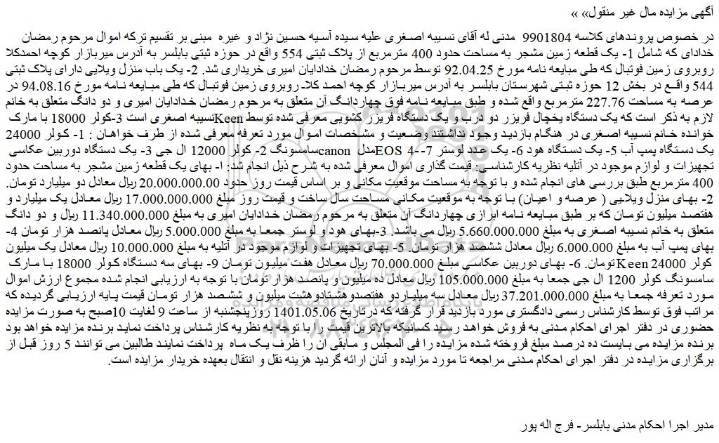 در خصوص پروندهای کلاسه 9901804 مدنی له آقای نسیبه اصغری علیه سیده آسیه حسین نژاد و غیره مبنی بر تقسیم ترکه اموال مرحوم رمضان خدادای که شامل 1- یک قطعه زمین مشجر به مساحت حدود 400 مترمربع از پلاک ثبتی 554 واقع در حوزه ثبتی بابلسر به آدرس میربازار کوچه احمدکلا روبروی زمین فوتبال که طی مبایعه نامه مورخ 92.04.25 توسط مرحوم رمضان خدادایان امیری خریداری شد. 2- یک باب منزل ویلایی دارای پلاک ثبتی 544 واقع در بخش 12 حوزه ثبتی شهرستان بابلسر به آدرس میربازار کوچه احمد کلا روبروی زمین فوتبال که طی مبایعه نامه مورخ 94.08.16 در عرصه به مساحت 227.76 مترمربع واقع شده و طبق مبایعه نامه فوق چهاردانگ آن متعلق به مرحوم رمضان خدادایان امیری و دو دانگ متعلق به خانم نسیبه اصغری است 3-کولر 18000 با مارک Keen لازم به ذکر است که یک دستگاه یخچال فریزر دو درب و یک دستگاه فریزر کشویی معرفی شده توسط خوانده خانم نسیبه اصغری در هنگام بازدید وجود نداشتند وضعیت و مشخصات اموال مورد تعرفه معرفی شده از طرف خواهان : 1- کولر 24000 سامسونگ 2- کولر 12000 ال جی 3- یک دستگاه دوربین عکاسی canon مدل EOS 4- یک دستگاه پمپ آب 5- یک دستگاه هود 6- یک عدد لوستر 7- تجهیزات و لوازم موجود در آتلیه نظریه کارشناسی: قیمت گذاری اموال معرفی شده به شرح ذیل انجام شد: ا- بهای یک قطعه زمین مشجر به مساحت حدود 400 مترمربع طبق بررسی های انجام شده و با توجه به مساحت موقعیت مکانی و بر اساس قیمت روز حدود 20.000.000.00 ریال معادل دو میلیارد تومان. 2- بهای منزل ویلایی ( عرصه و اعیان) با توجه به موقعیت مکانی مساحت سال ساخت و قیمت روز مبلغ 17.000.000.000 ریال معادل یک میلیارد و هفتصد میلیون تومان که بر طبق مبایعه نامه ابرازی چهاردانگ آن متعلق به مرحوم رمضان خدادایان امیری به مبلغ 11.340.000.000 ریال و دو دانگ متعلق به خانم نسیبه اصغری به مبلغ 5.660.000.000 ریال می باشد. 3-بهای هود و لوستر جمعا به مبلغ 5.000.000 ریال معادل پانصد هزار تومان 4- بهای پمپ آب به مبلغ 6.000.000 ریال معادل ششصد هزار تومان. 5- بهای تجهیزات و لوازم موجود در آتلیه به مبلغ 10.000.000 ریال معادل یک میلیون تومان. 6- بهای دوربین عکاسی مبلغ 70.000.000 ریال معادل هفت میلیون تومان 9- بهای سه دستگاه کولر 18000 با مارک Keen کولر 24000 سامسونگ کولر 1200 ال جی جمعا به مبلغ 105.000.000 ریال معادل ده میلیون و پانصد هزار تومان با توجه به ارزیابی انجام شده مجموع ارزش اموال مورد تعرفه جمعا به مبلغ 37.201.000.000 ریال معادل سه میلیاردو هفتصدوهشتادوهشت میلیون و ششصد هزار تومان قیمت پایه ارزیابی گردیده که مراتب فوق توسط کارشناس رسمی دادگستری مورد بازدید قرار گرفته که درتاریخ 1401.05.06 روزپنجشنبه از ساعت 9 لغایت 10صبح به صورت مزایده حضوری در دفتر اجرای احکام مدنی به فروش خواهد رسید کسانیکه بالاترین قیمت را با توجه به نظریه کارشناس پرداخت نماید برنده مزایده خواهد بود برنده مزایده می بایست ده درصد مبلغ فروخته شده مزایده را فی المجلس و مابقی ان را ظرف یک ماه پرداخت نمایند طالبین می توانند 5 روز قبل از برگزاری مزایده در دفتر اجرای احکام مدنی مراجعه تا مورد مزایده و آنان ارائه گردید هزینه نقل و انتقال بعهده خریدار مزایده است.