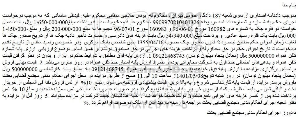 بموجب دادنامه اصداری از سوی شعبه 187 دادگاه عمومی تهران ، محکوم له: یونس حلاجی ممقانی محکوم علیه: محمدتقی ساسانی  که  به موجب درخواست اجرای حکم به شماره و شماره دادنامه مربوطه 9909970210401326 محکوم علیه محکوم است به پرداخت مبلغ1،650،000،000 ریال بابت اصل خواسته دو فقره چک به شماره های 160982 مورخ 96،06،01 و 160983 مورخ 96،07،01 مجموعا به مبلغ 200،000،000 ریال و مبلغ 1،450،000،000 ریال بابت یک فقره رسید عادی.  و پرداخت مبلغ 54،940،000 ریال بابت هزینه های دادرسی و خسارت تاخیر تادیه چک ها از تاریخ صدور چک ها لغایت زمان اجرای حکم مطابق تبصره 2 قانون صدور چک مصوب 1355/04/16 طبق شاخص بانک مرکزی  ودر خصوص رسید عادی از تاریخ تقدیم دادخواست تا تاریخ اجرای حکم در حق محکوم له و پرداخت هزینه های اجرایی در حق صندوق دولت. بر همین اساس موضوع ارزیابی  ارزش پایه شماره تلفن همراه 500000000 ریال (معادل پنجاه میلیون تومان) 09121468745 1. ارزش پایه فوق مطابق با شرایط حاکم در بازار و بدون در نظر گرقتن قیمت تلفن همراه و بدهی های احتمالی خط فوق به شرکت مخابراتی بوده و صرفا ارزش پایه امتیاز خط تلفن همراه در روز جاری می باشد. 2. قیمت نهایی فروش براساس برگزاری مزایده با ارزش پایه فوق خواهدبود.. حالیه مقرر گردید تلفن  همراه  09121468745 به  مبلغ  پایه  کارشناسی 500000000 ریال (معادل پنجاه میلیون تومان)  در روز شنبه تاریخ1401/05/08از ساعت 10 الی 11 صبح از طریق مزایده در محل اجرای احکام مدنی مجتمع قضایی بعثت بفروش برسد. مزایده از قیمت پایه کارشناسی شروع و به بالا ترین  قیمت پیشنهادی فروخته می شود . مبلغ  10%  از ثمن فروش نقدا فی المجلس از خریدار اخذ و الباقی ثمن می بایست ظرف یکماه از سوی خریدار به این شعبه تودیع گردد ، در صورت عدم پرداخت الباغی ثمن ، مزایده تجدید و مبلغ 10 %  ثمن پرداخت شده پس از کسر هزینه های اجرایی بنفع صندوق دولت ضبط خواهد شد  .  کلیه علاقمندان جهت شرکت در مزایده میتوانند  5  روز قبل از مزایده به دفتر شعبه اجرای احکام مدنی مجتمع قضایی بعثت مراجعه تا زمینه بازدید آنان از ملک موصوف فراهم گردد .%