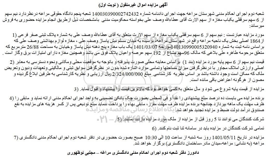 شعبه دوم اجرای احکام مدنی شهرستان مراغه جهت اجرای دادنامه شماره 140030390002742432 شعبه پنجم دادگاه حقوقی مراغه درنظردارد نیم سهم از 6 سهم سرقفلی یکباب مغازه از سهم الارث آقای عطاءالله وصف علی بخواسته محکومیت مدنی بامشخصات ذیل ازطریق انجام مزایده حضوری به فروش میرساند: