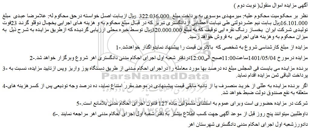 نظر بر محکومیت محکوم علیه: میرمهدی موسوی به پرداخت مبلغ  322.036.000  ریال ازبابت اصل خواسته درحق محکوم له: غلامرضا عبدی  مبلغ 16.101.000ریال بابت نیم عشردولتی طی نیابت اعطایی ازدادگستری تبریز که در قبال مبلغ محکوم به و هزینه های اجرایی یخچال دوقلو گرند 23فوت تولیدی شرکت ایران  یخساز رنگ نقره ایی توقیف که به مبلغ 320.000.000ریال توسط خبره محلی ارزیابی گردیده که ازطریق مزایده به شرح ذیل  به میزان محکوم به وهزینه های اجرایی  به فروش خواهد رسید.