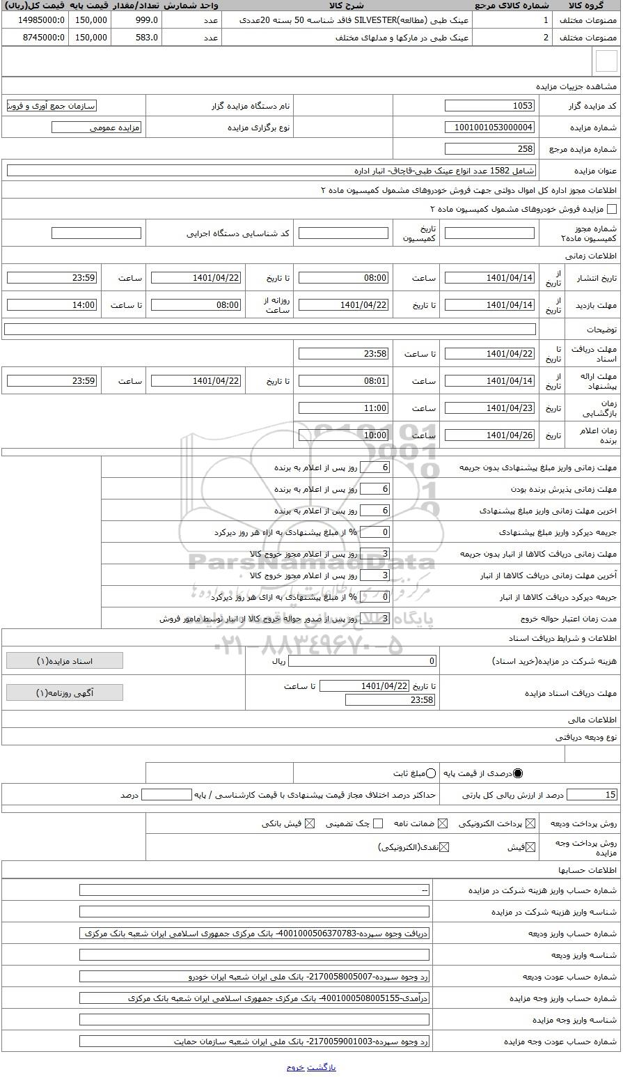 مزایده عمومی مزایده ، شامل 1582 عدد انواع عینک طبی-قاچاق- انبار اداره برگزار میگردد. از کلیه افراد متخصص و شرکت‌های واجد شرایط دعوت به عمل می‌آید تا در این مزایده با کد خبرگزاری پارس نماد : 4702514 شرکت نمایند تاریخ شروع مزایده : 1401/04/14 مهلت شرکت در مزایده: تا پایان روز 1401/04/22 مکان برگزاری اموال واگذاری استان‌های گیلان و دسته‌بندی‌های مربوط به این حراجی متفرقه میباشد. اطلاعات دقیق‌تر درباره شرایط شرکت در مزایده آنلاین و نحوه ارسال مدارک، الزامات پروژه و دریافت اسناد مزایده و تاریخ بازگشایی پاکت‌ها، در بخش اطلاعات تکمیلی این آگهی درج شده است.