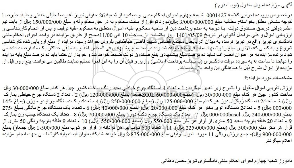 درخصوص پرونده اجرایی کلاسه 0001427 شعبه چهارم اجرای احکام مدنی و صادره از شعبه 26 حقوقی تبریز له:رضا جلیلی خدائی وعلیه: علیرضا کوچه مشکی مطلق بخواسته: مطالبه مبلغ 3/000/000/000 ریال(مورد توافق) از بابت محکوم به در حق محکوم له و مبلغ 150/000/000 ریال از بابت نیم عشردولتی درحق صندوق دولت- با توجه به عدم پرداخت دین از ناحیه محکوم علیه، اموال متعلق به محکوم علیه توقیف و پس از انجام کارشناسی و ارزیابی اموال و طی مراحل قانونی در تاریخ 1401/05/09 روز یکشنبه از ساعت 10 الی 11/00صبح از طریق مزایده در واحد اجرای احکام مدنی دادگستری تبریز واقع در تبریز نرسده به میدان اذربایجان مجتمع قضائی شهید قاضی طباطبایی بفروش خواهد رسید، مزایده از مبلغ ارزیابی شده کارشناسی شروع و به کسی که بالاترین مبلغ را پیشنهاد نماید فروخته خواهد شد وده درصد مبلغ پیشنهادی فی المجلس اخذ و به مابقی حداکثر یک ماه فرصت داده می شود برنده مزایده به هر عنوان انصراف نماید ده درصد مبلغ پیشنهادی بنفع صندوق دولت ضبط خواهد شد و خریداران حتما باید ده درصد مبلغ پایه مزایده را نهایتا تا ساعت 9 به سپرده موقت دادگستری (با شناسه پرداخت اعلامی) واریز و فیش آن را به این اجرا تسلیم نمایند طالبین می توانند، پنج روز قبل از مزایده از اموال بشرح ذیل با هماهنگی این واحد بازدید نمایند.